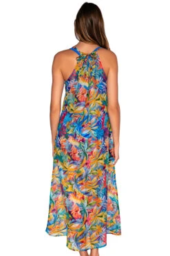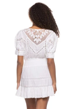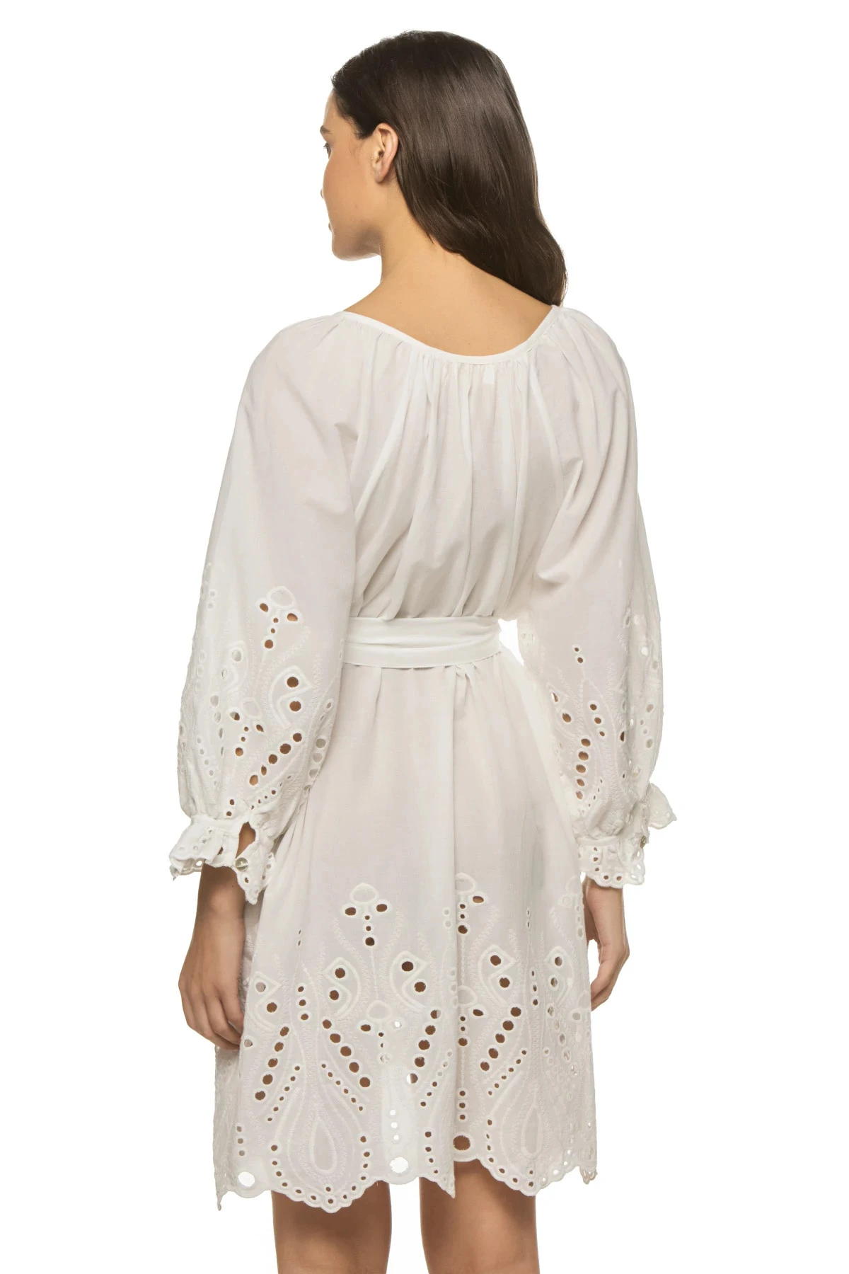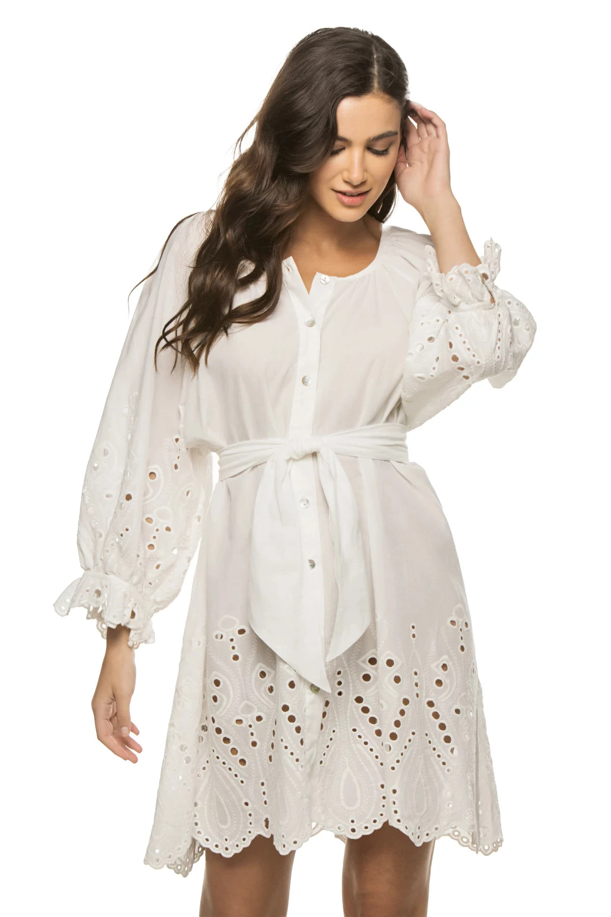Alex mini dress features an embroidered fabric with long ruffled sleeves. Offers a button up closure and a removable sash.