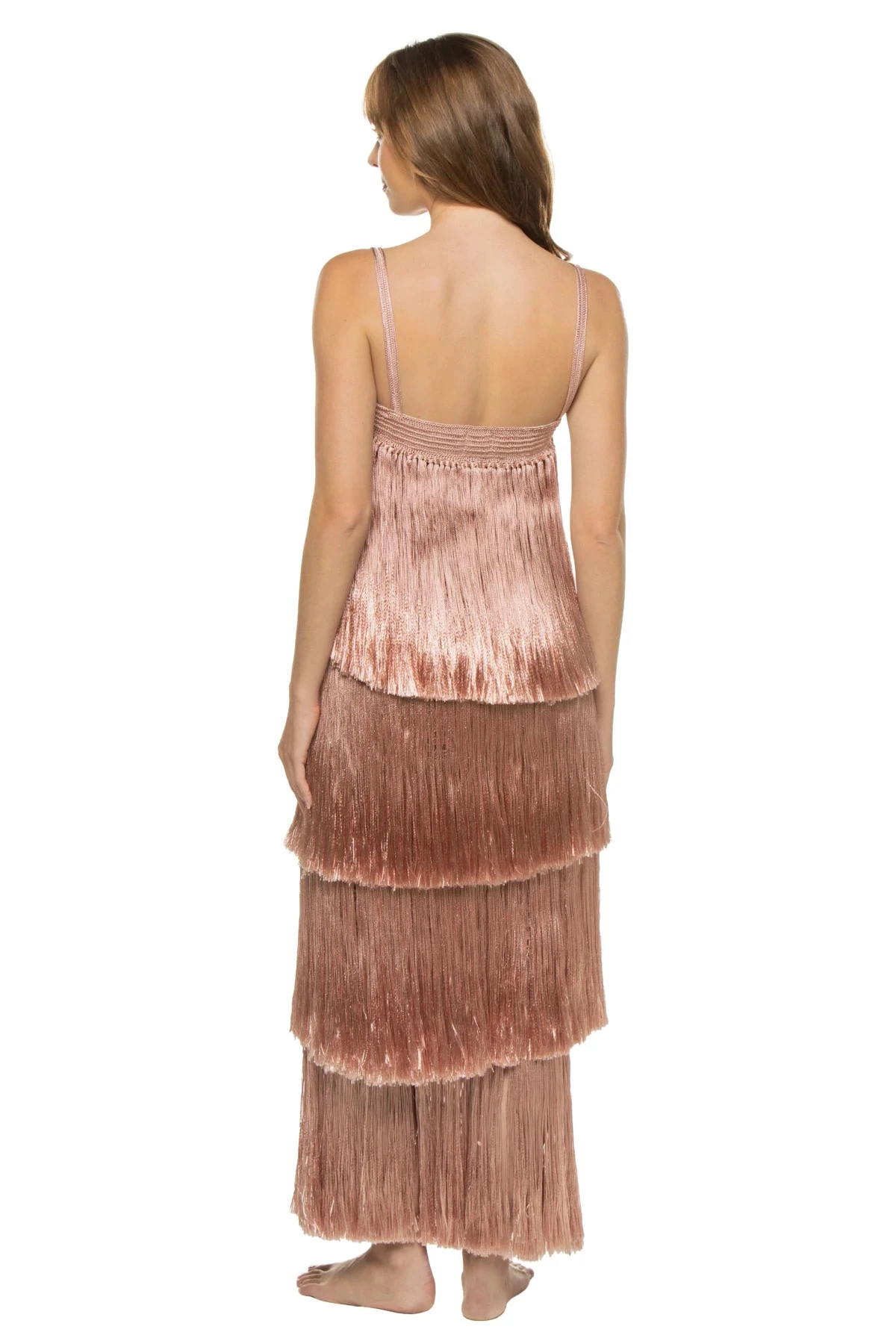 Angelica Fringed Maxi Dress is hand crocheted with tiers of silky fringe, an elastic band at the top and spaghetti straps that can be worn in or out. The perfect blend of beachy boho chic with effortless, stand out glam.