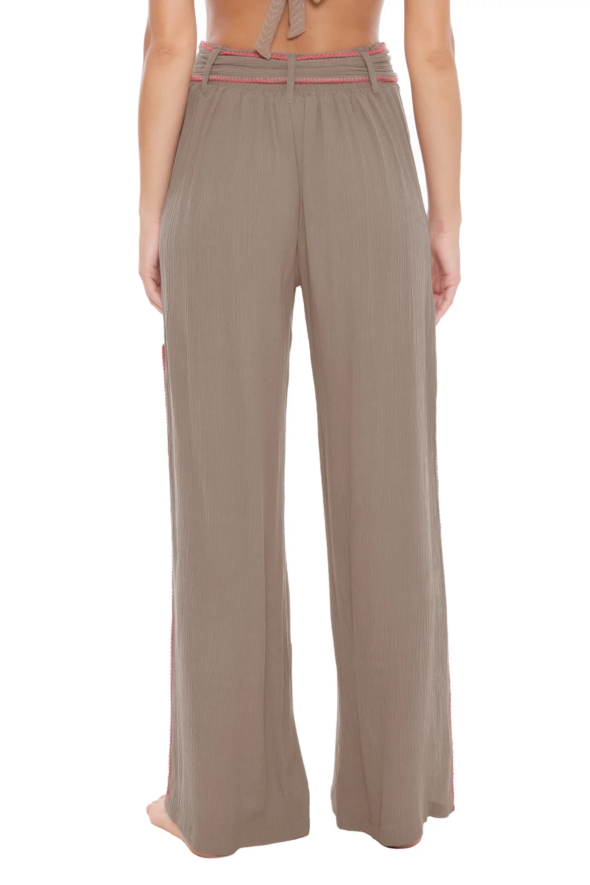 Brittany pant features contrast edge stitching and side slits and offers an adjustable buckle belt with tiered tassel ends.