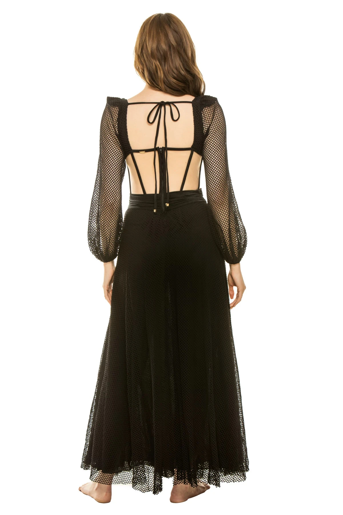 Bustier maxi beach dress features an open net fabric with tulle panel, built-in bodysuit, and supportive underwire with soft molded cups. Offers inset boning, a bottom snap closure and a hidden back zipper closure.