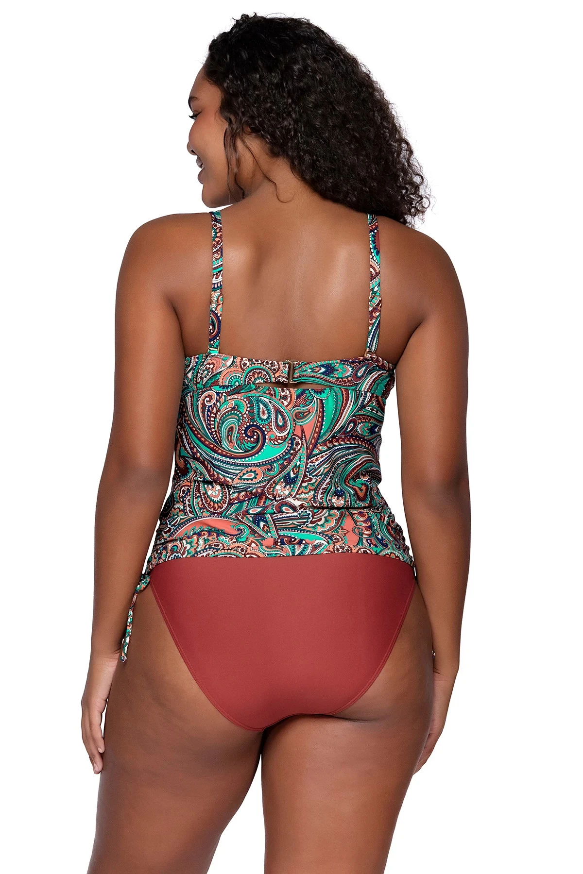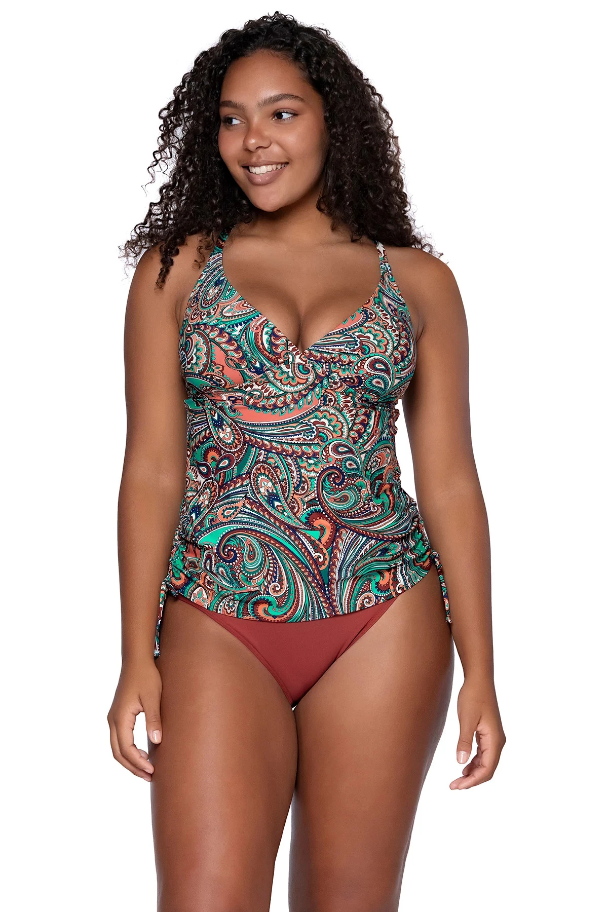 The Cassie Tankini is a flattering dream. With its V neckline and pleating, it is effortlessly feminine. This tankini is slim fitting with ruching on the sides. Cute spaghetti ties on the side offer adjustability. This top has an underwire, removable cups, adjustable straps with a convertible cross-back, and a hidden hook and eye back closure.