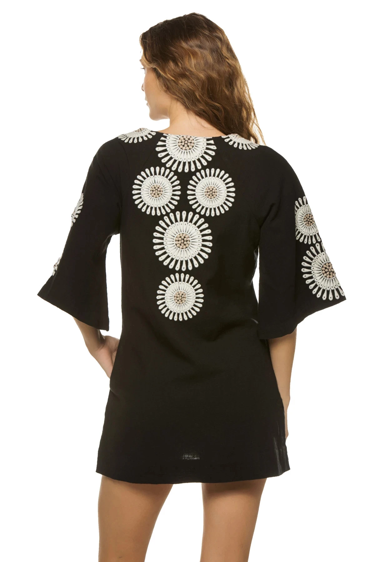 Charming mini dress features a decorative fabric and flattering volume with a mini-length silhouette. Offers wide, short sleeves with a deep v-neckline and pockets.