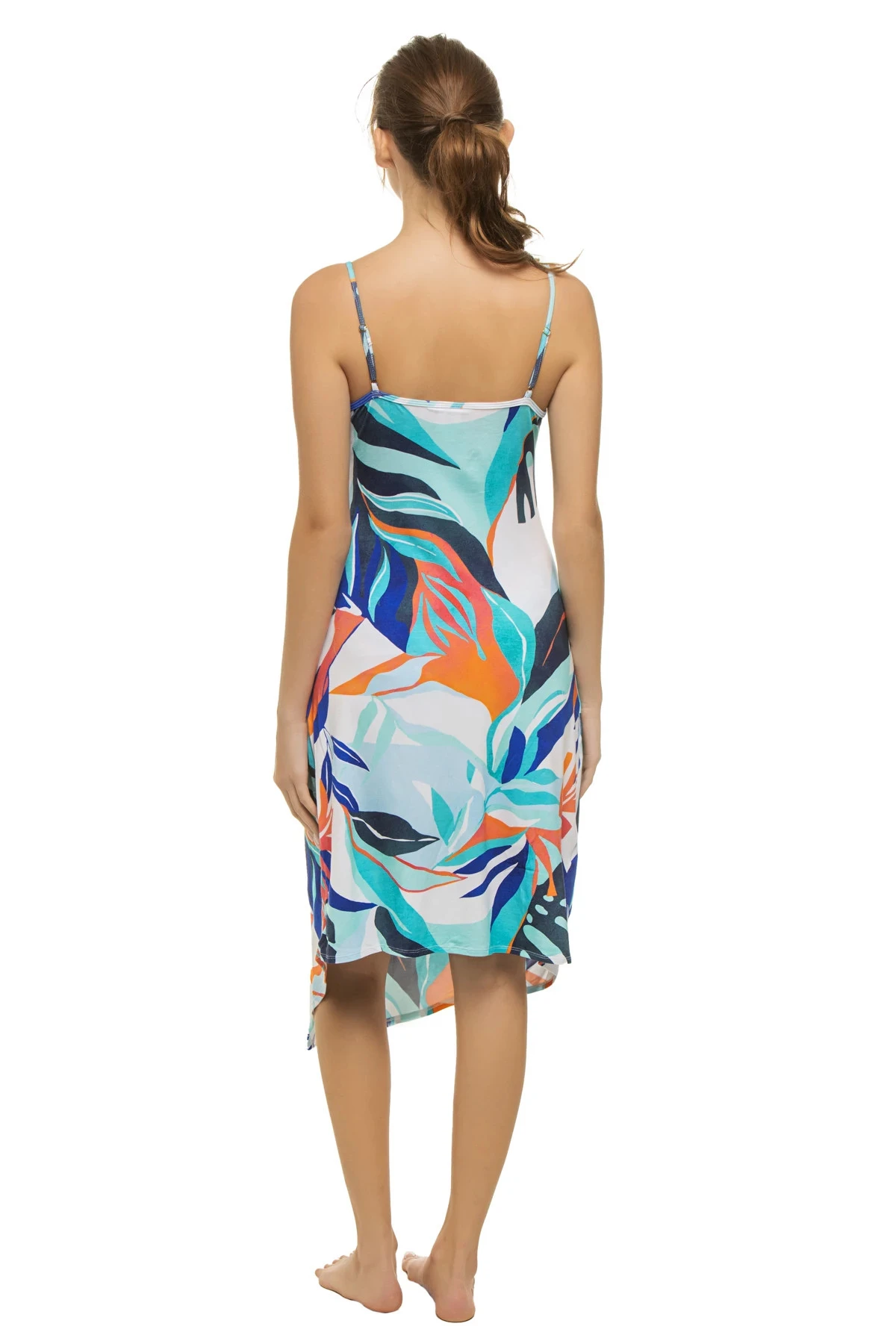 Midi dress features a tropical palm print with an asymmetrical drape detail at waist and offers adjustable straps.