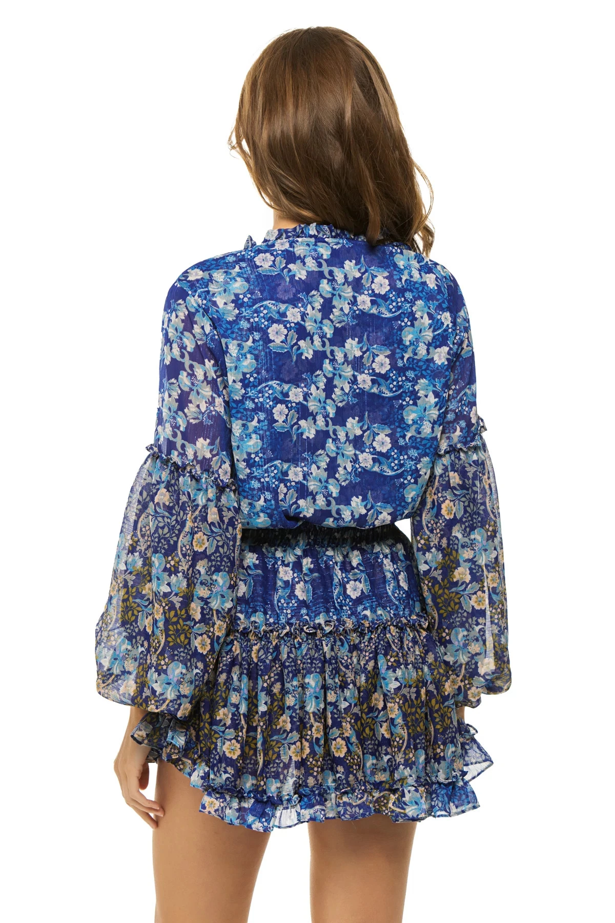 Elisibetta mini dress features a floral print with long puff sleeves and offers a split neck with loose tassel ties, a smocked waist and a tiered ruffle skirt.