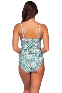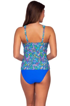 The Elsie Tankini provides sophisticated coverage and comfort. A “V” neckline, wide shoulder straps, and relaxed fit. A cute crossover neckline is a subtle and flattering accent. This tankini has an underwire, j-hook, adjustable straps, removable cups, and a hidden bra hook and eye closure.