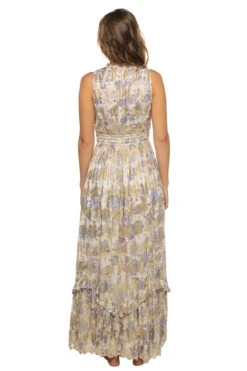 Eshe mini dress features a stripe fabrication with a v-neckline, three-quarter flutter sleeves and a tiered ruffle skirt with a raw fringe trim.