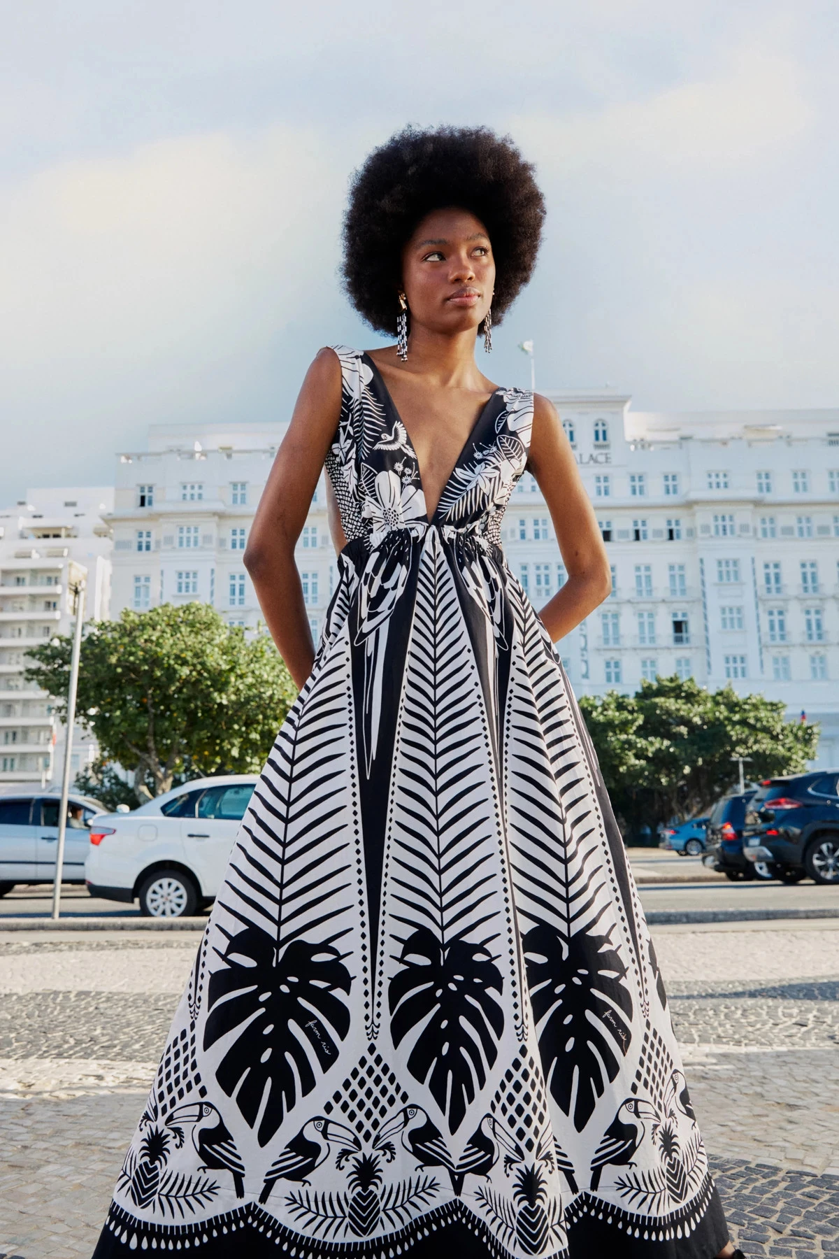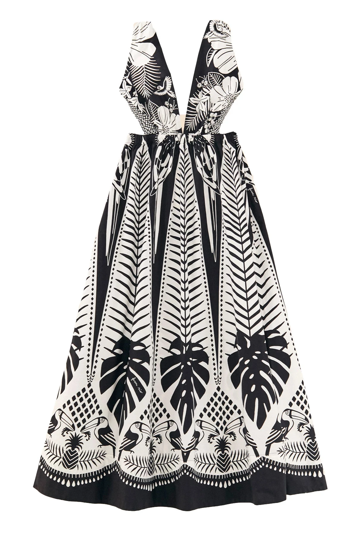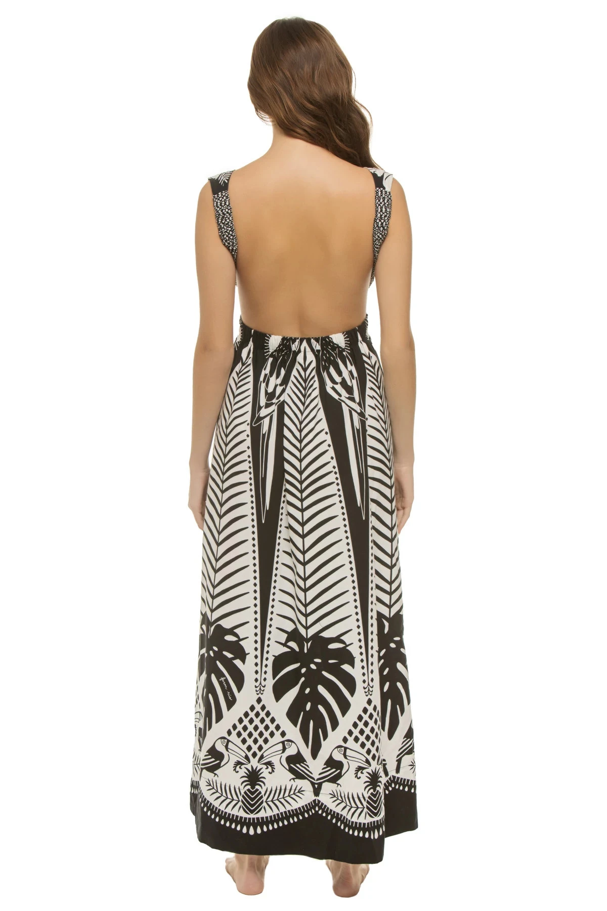 Maxi dress features an intricate tropical print with a smocked elastic waistband and open back.
