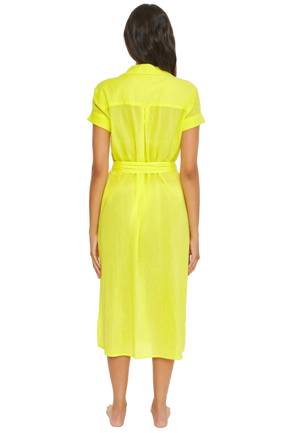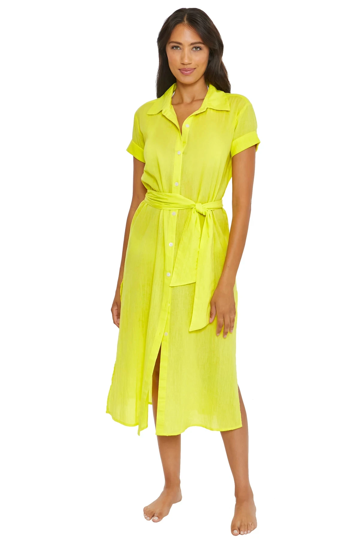 Gauzy midi dress features a collared neckline with a button up closure and cuffed short sleeves. Offers an adjustable waist tie.