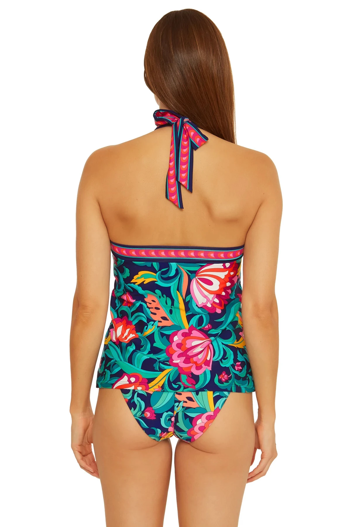 India Garden high neck tankini top features a reversible floral print to solid navy and removable cups. Offers adjustable ties at neck.