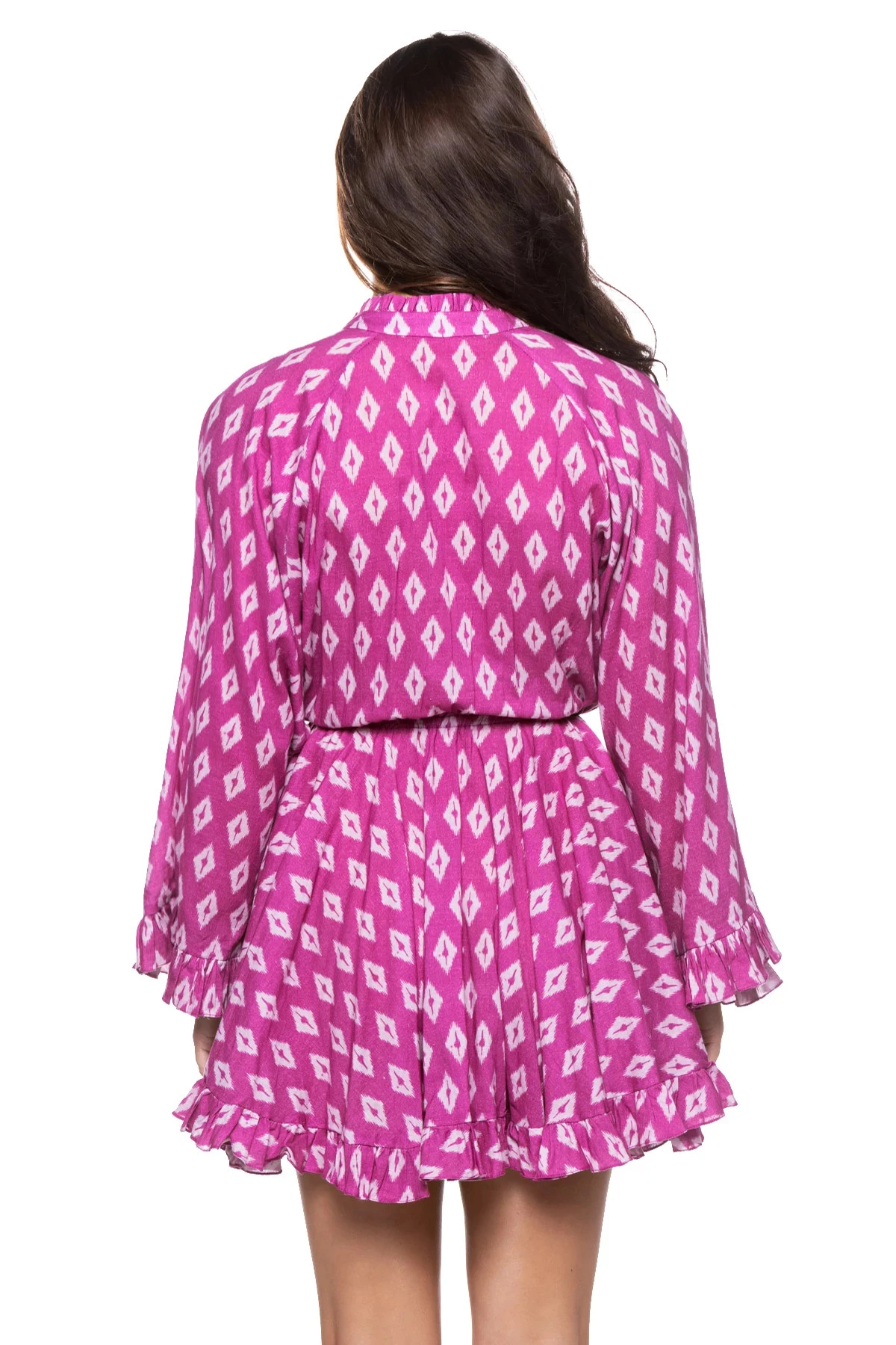 Irina mini dress features a button up front with a ruffled collared neckline offers a soft elastic waistline and long belle sleeves.