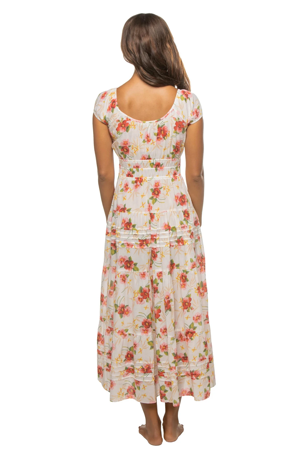 Magdaline midi dress features an elegant floral print with a tiered skirt and offers a drawstring neckline and adjustable side slit.