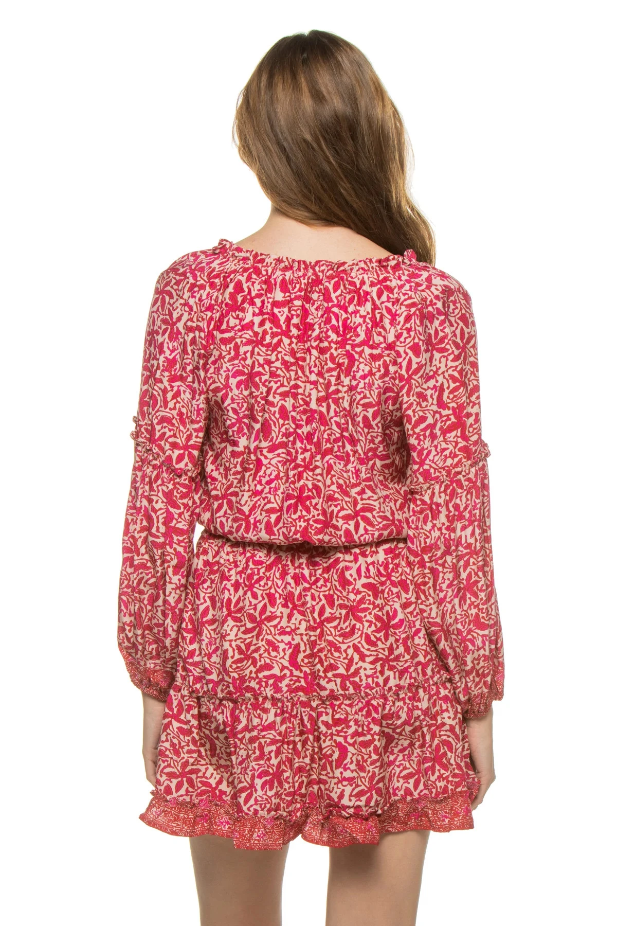 Maggie dress features a ruffled split neck and long raglan sleeves and offers cased elastic cuffs and waist.