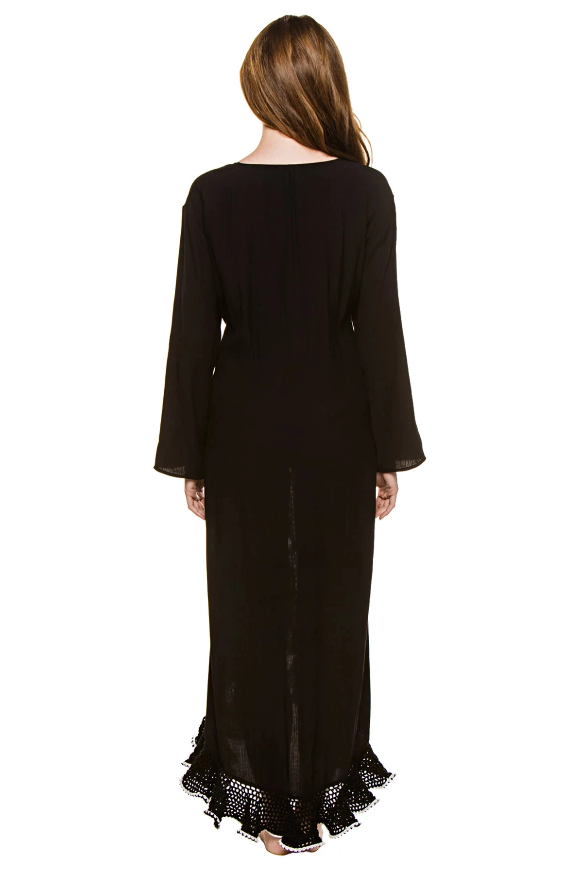 Mambo cover up features long sleeves and a unique hand crocheted ruffle hem and offers a center tie closure.