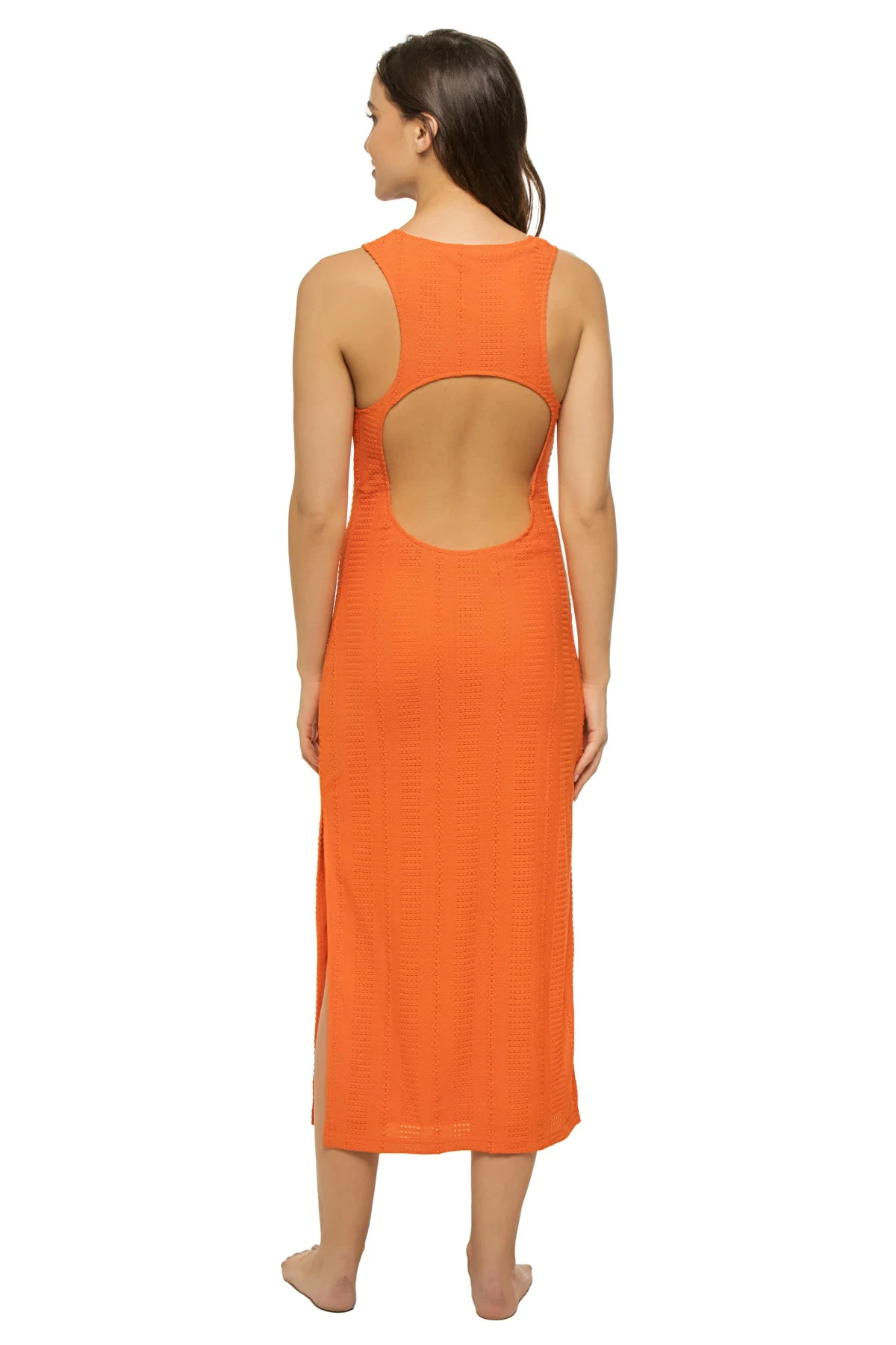Hailey midi dress features a textured knit fabric with an open back and side slits.