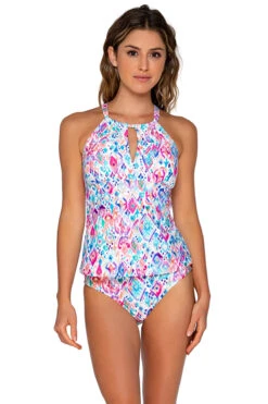 This essential tankini is our interpretation of the season’s hottest trend, the high neck. With a subtle peek-a-boo opening and a shirred neckline, elegance and grace never looked so good. Other features include cross-back straps with soft ties for adjustability, removable soft cups, and matching colored lining.