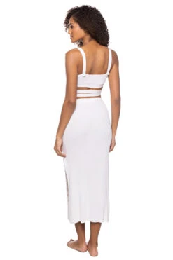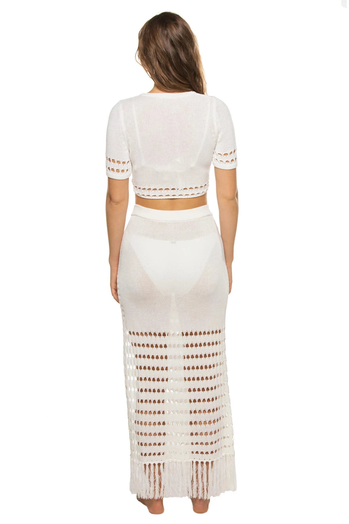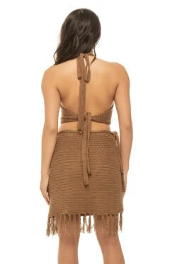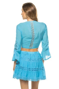 Nirvana crop top features short sleeves, long ties with tassels at the ends and can be worn fully open or tied at center front.