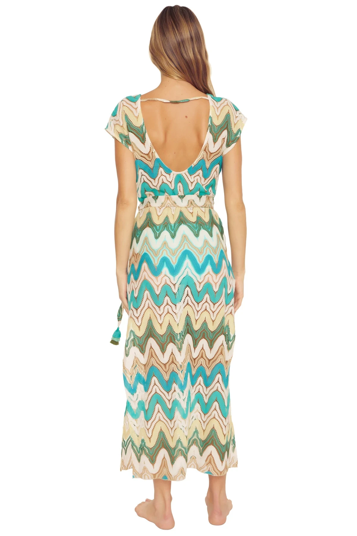 Palisades midi dress features a crochet fabrication with a matching fabric belt at waist accentuated with decorative tassel ends. Offers a front and back scoop neckline and side slit.