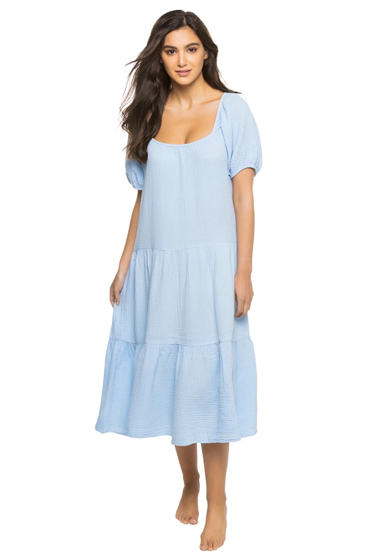 Pamela midi dress features a relaxed fit, soft, squared neckline with subtle puff sleeves and a tiered, lightly ruffled skirt.