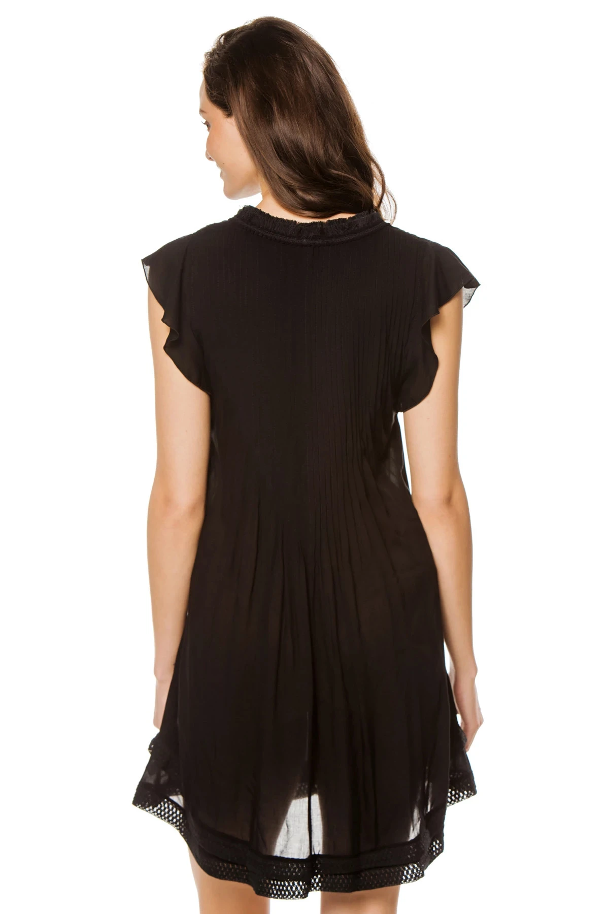 The Sasha mini dress is a beautiful dream of a dress featuring flutter cap sleeves and a dramatic fringed neckline with curved lace hem adding elegance.