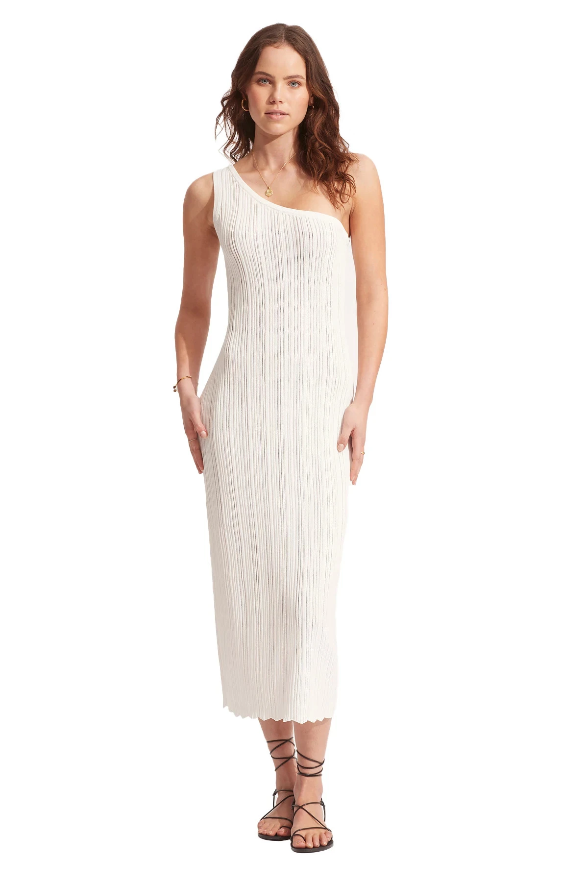Midi dress features a cotton crochet knit fabric with an asymmetrical neckline and side slit.
