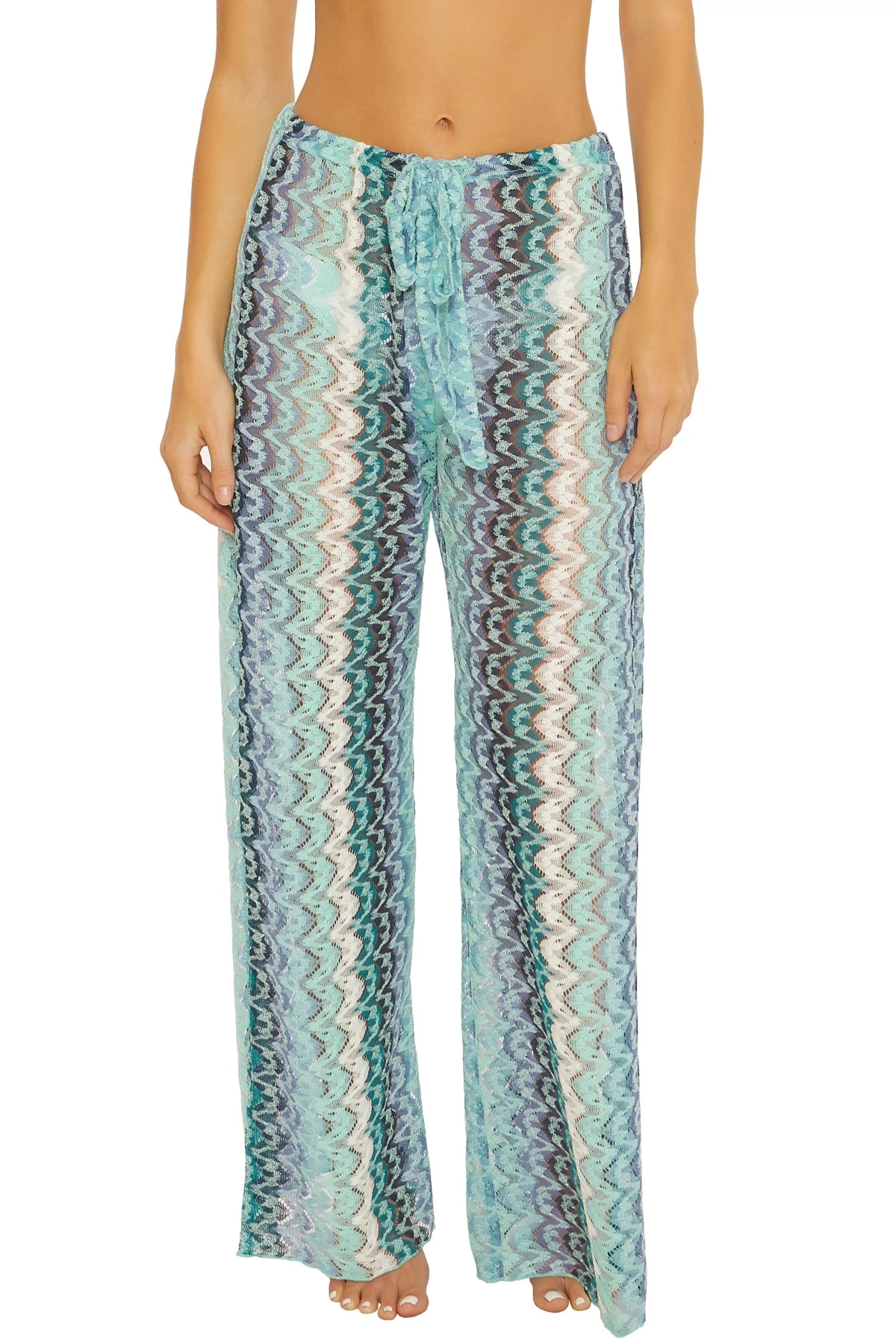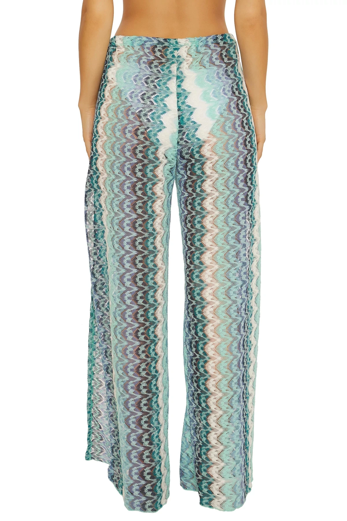 Solstice pants feature a multi-colored crochet fabrication with split leg openings and offers adjustable drawstring ties at waist.