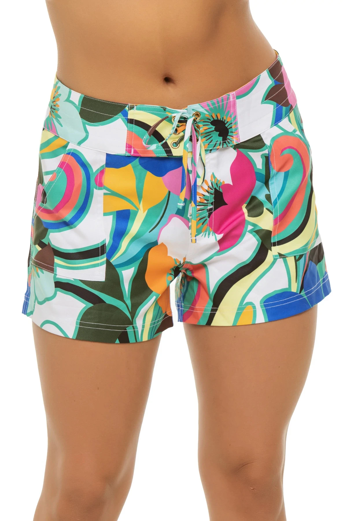 Sun catcher board shorts feature a fun tropical print with pockets and offers an adjustable drawstring waist.