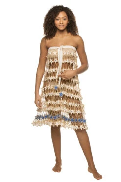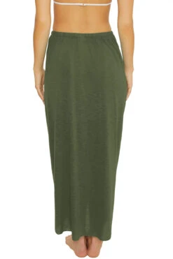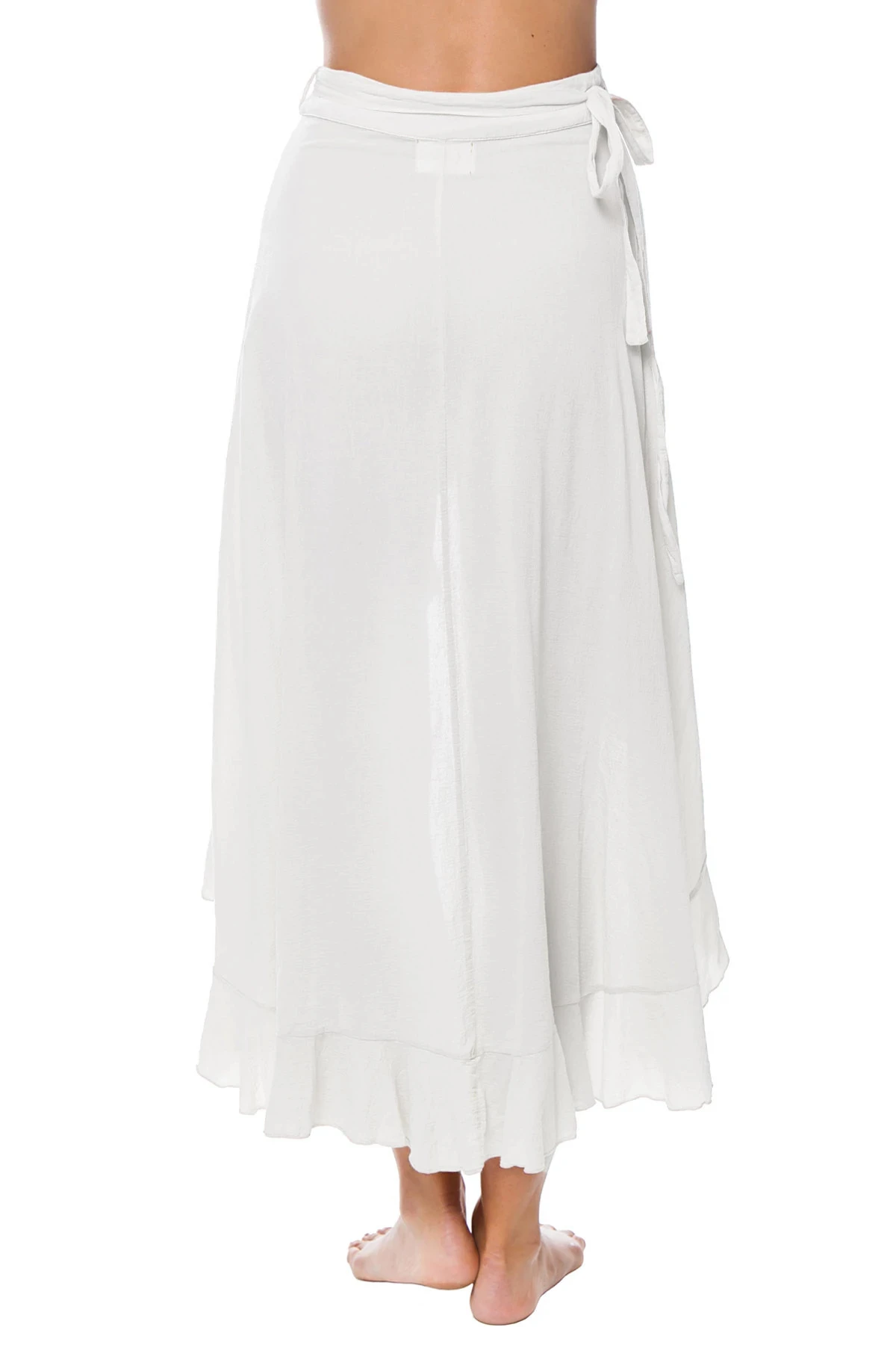 Mid length skirt features hi-low tulip hem with ruffle edge and adjustable wrap around ties at waist.
